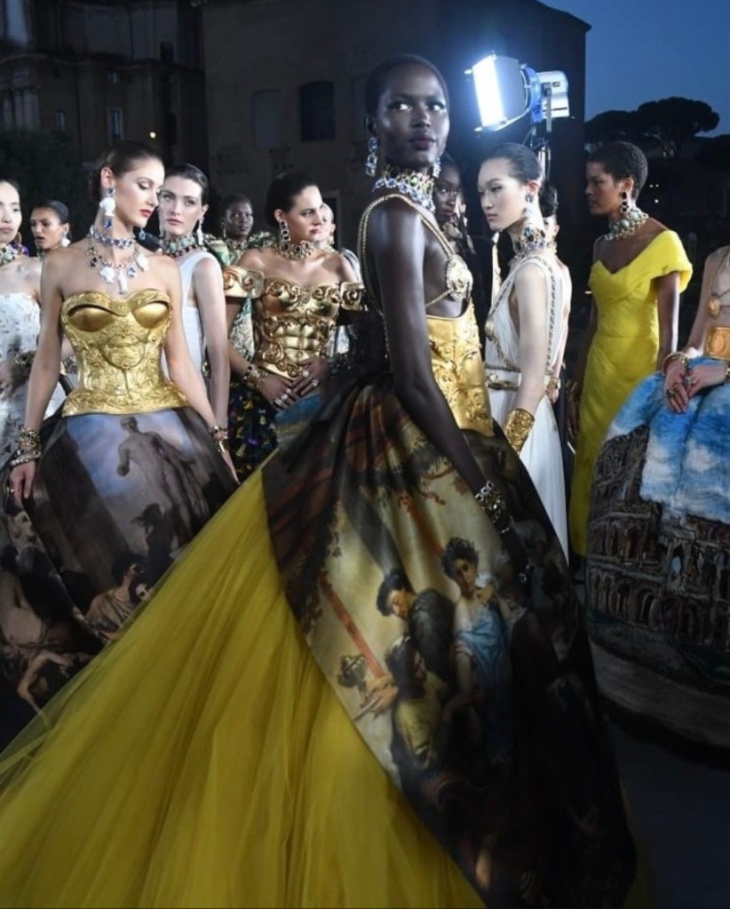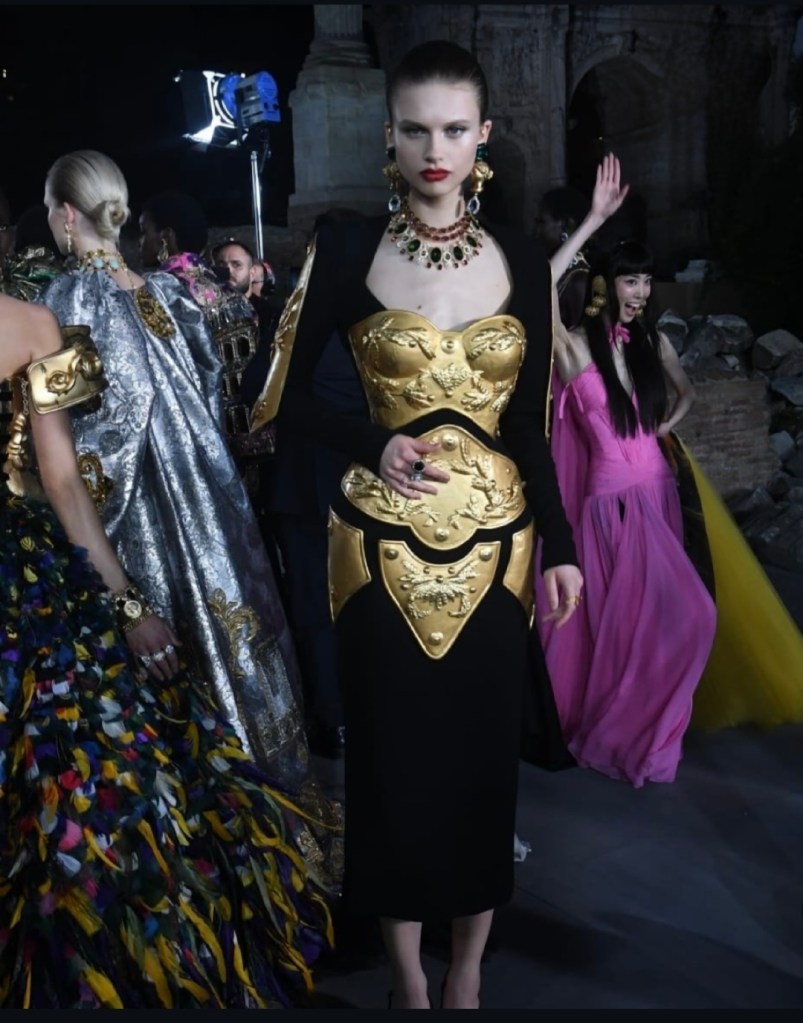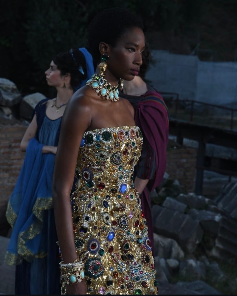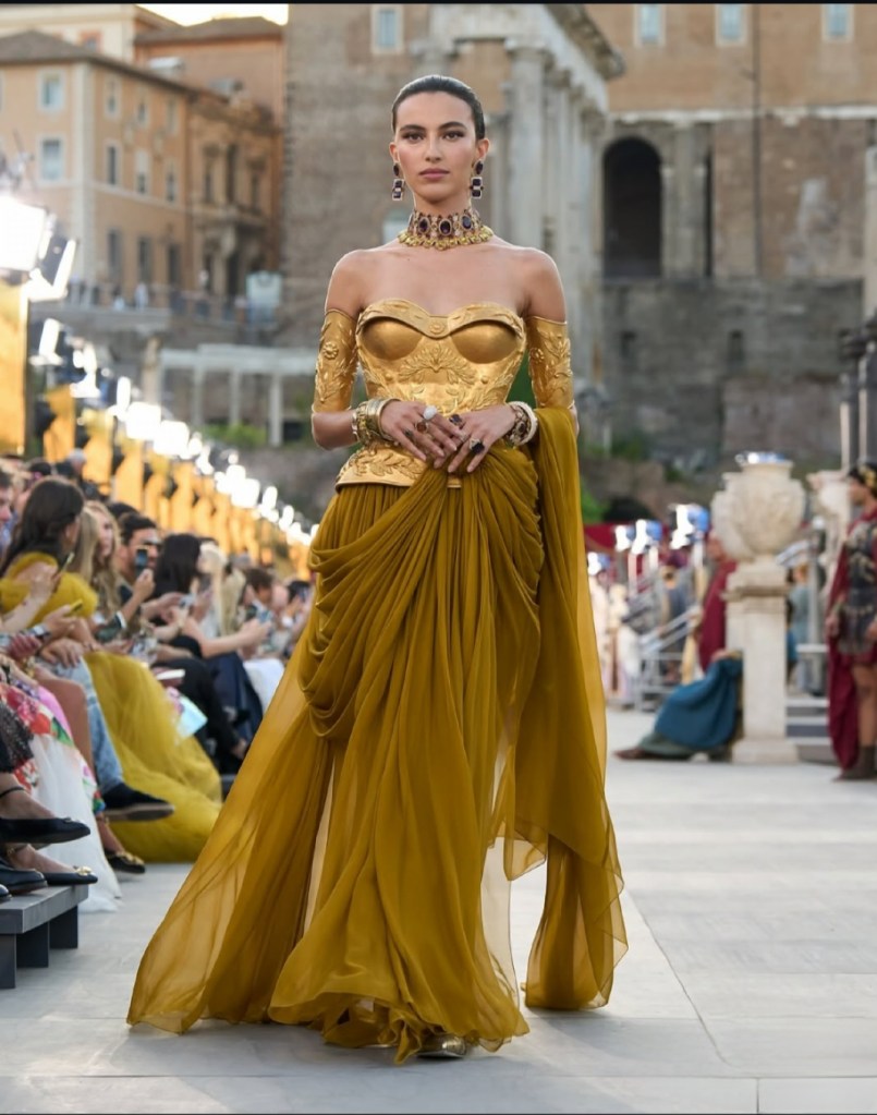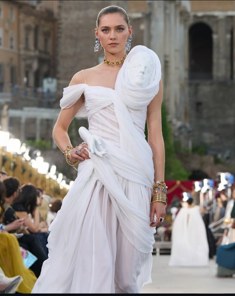 O pár měsíců později se Alta Moda přesunula do Říma – rovnou na Forum Romanum. Kolekce zde čerpala inspiraci z antiky: římské sloupy, mozaiky, vlci i nápis Veni, vidi, vici se objevily na róbách bohatě zdobených drahokamy. Nechyběl ani hollywoodský glamour 50. let v duchu La Dolce Vita.Medzi hosťami zažiarila Cher, ktorá otvorila prehliadku v ikonickom catsuite, Erling Haaland a dokonca aj Christian Bale s rodinou.