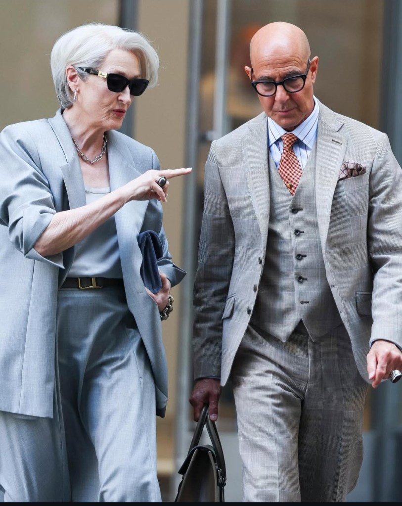 Světlá vlna, dokonale vyvážené proporce, tlumená elegance. Žádné výstřednosti, žádné logo přes prsa. Jen čistá síla, která nepotřebuje křičet, aby ji bylo slyšet. Tento styling by klidně mohla nosit Miranda Priestly. Nebo kdokoli, kdo má vlastní vizi a odvahu ji žít.