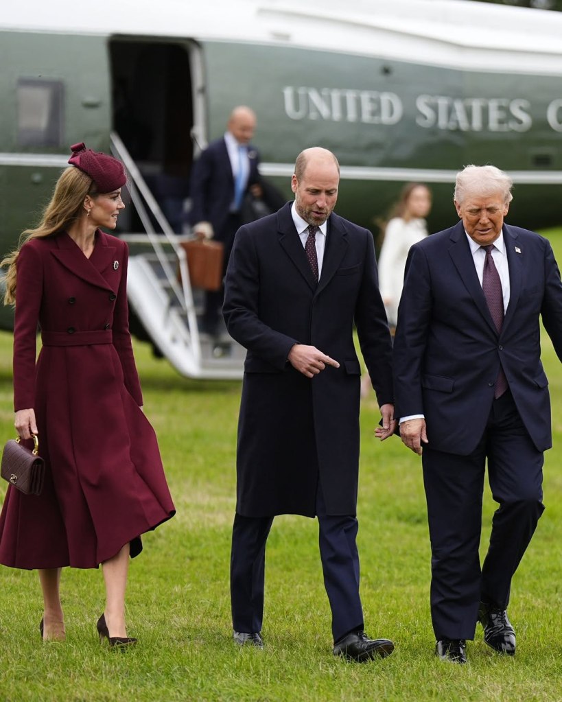 Earlier in the day, Princess Catherine welcomed the American delegation in a double-breasted burgundy coatdress by Emilia Wickstead. The choice was refined and deliberate: the tailored silhouette evoked quiet authority, while the deep shade of burgundy projected warmth and gravitas, making it a perfect ensemble for the formality of the moment.