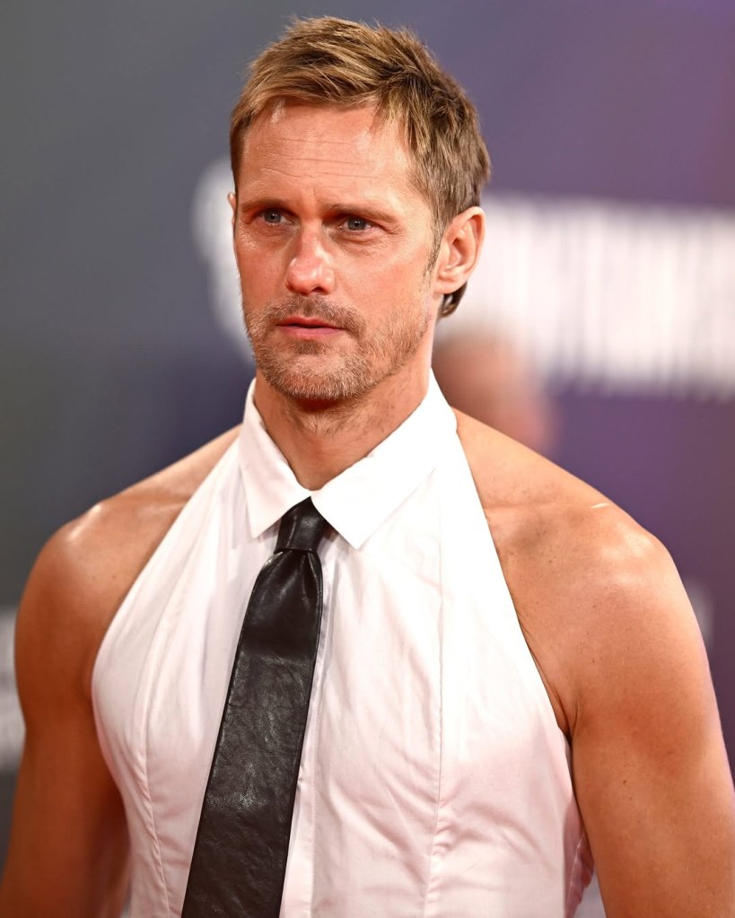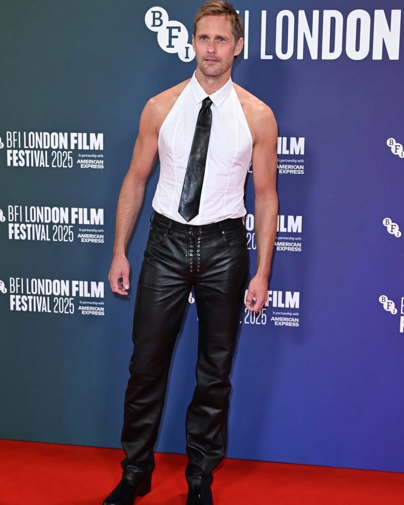 Last night, the BFI London Film Festival became the ultimate stage for Alexander Skarsgård to showcase his bold and daring red carpet style. The star turned heads in a striking full look by Ludovic de Saint Sernin, featuring a backless halter neck shirt that perfectly captured a mix of modern masculinity, confidence, and leather daddy energy.