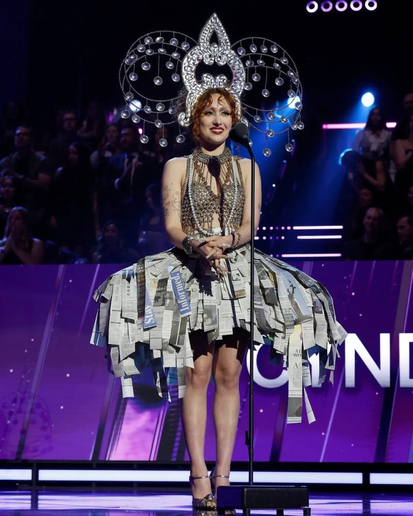 Chappell Roan at the 2025 Rock & Roll Hall of Fame, Los Angeles.In a custom newspaper-print look and glittering headpiece, she turned the red carpet into her stage. (Photo by Jeff Kravitz / FilmMagic)