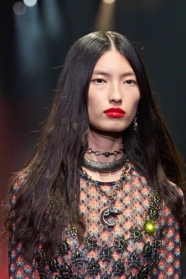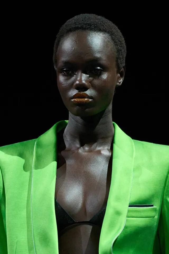 Přesto se mezi jemností objevil výrazný, barevný rty, který se stal hlavním statementem. Na několika přehlídkách se objevily syté odstíny červené, fuchsiové i nečekané neonové barvy, což dokazuje, že jeden výrazný detail dokáže proměnit celý look. Od Dior Men po Valentino make-up artisté používali rty jako ústřední bod, kombinující klasickou eleganci s hravým moderním twistem.