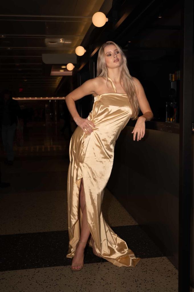 At the center of the story stands a silk gown in luminous champagne hues, moving effortlessly through the historic halls of the terminal. Its fluidity mirrors liquid light, reflecting the cinematic glow of the architecture while maintaining an intimate presence. In a space defined by scale and spectacle, Ismaelina’s design chooses quiet confidence over excess — a reminder that true luxury never competes, it commands.
