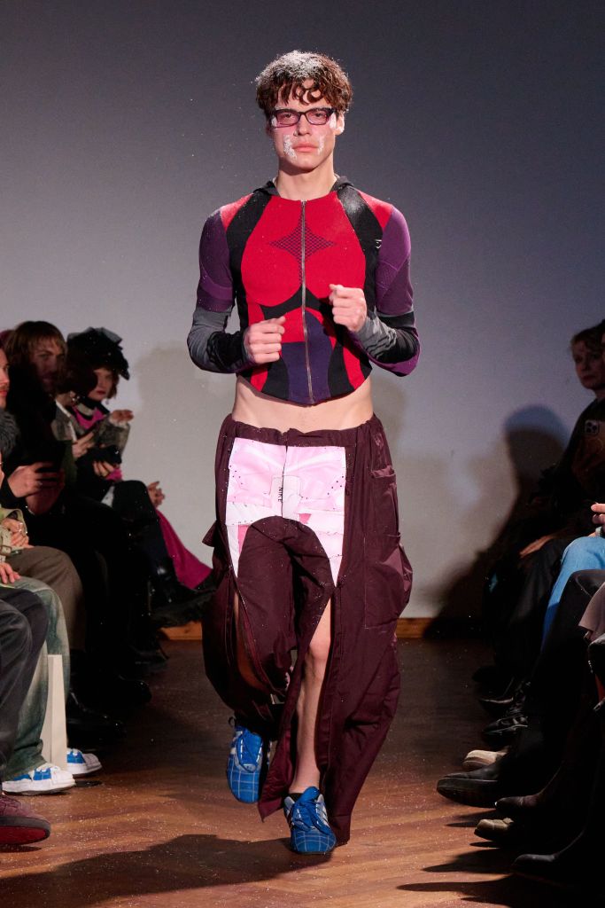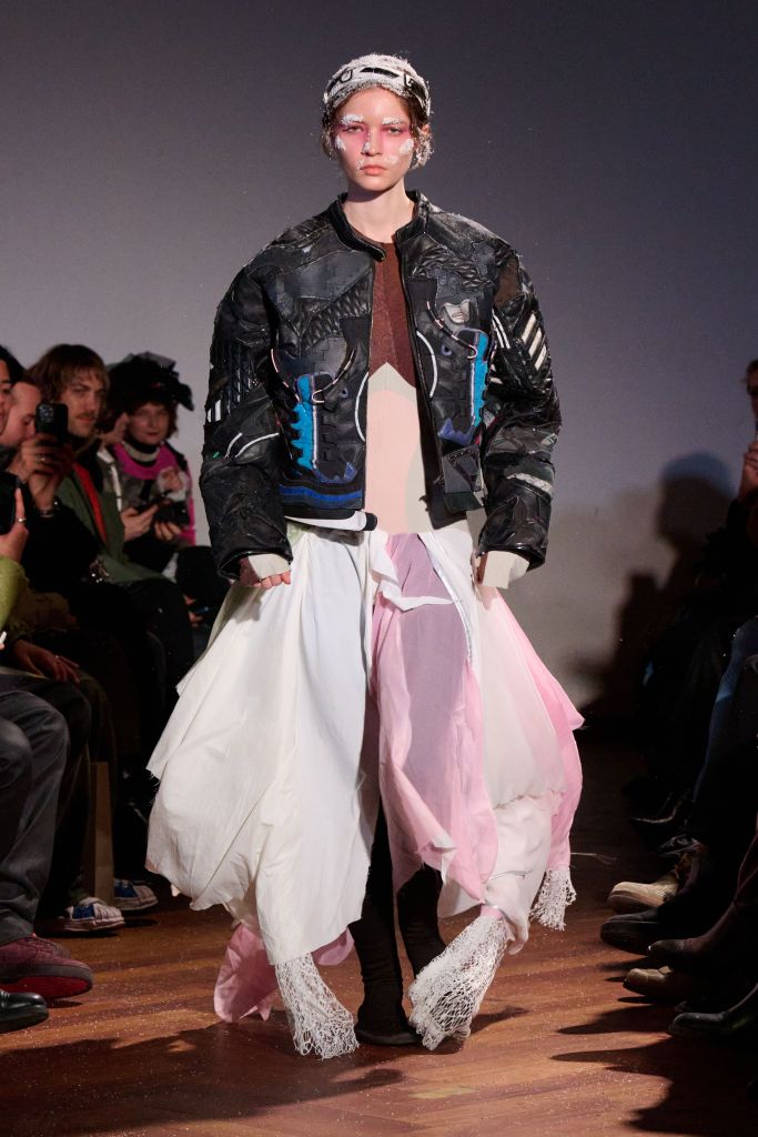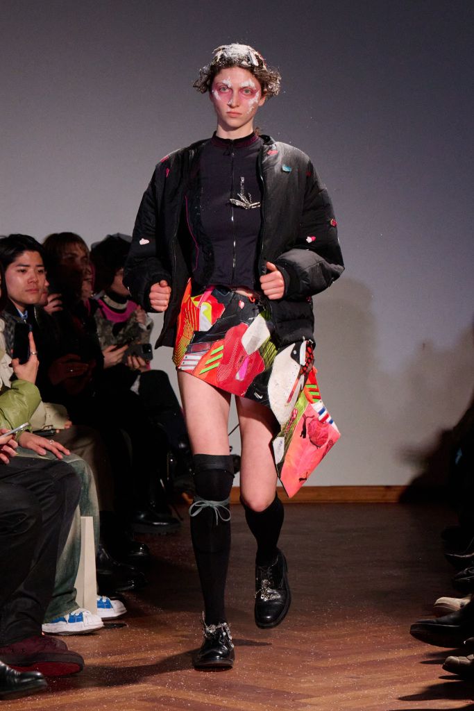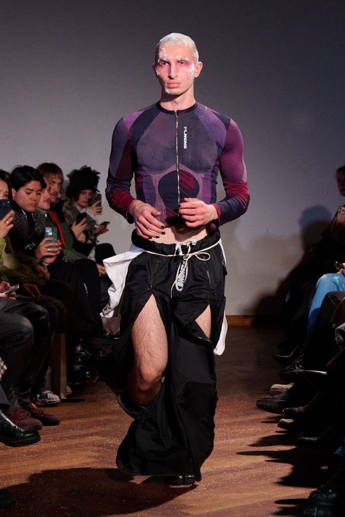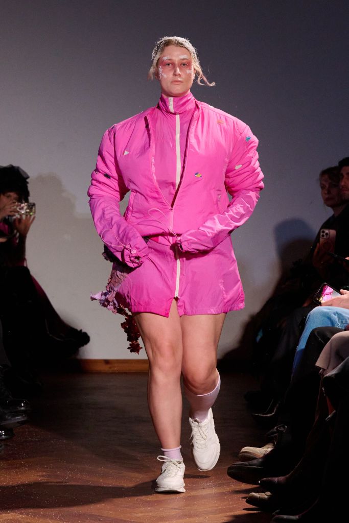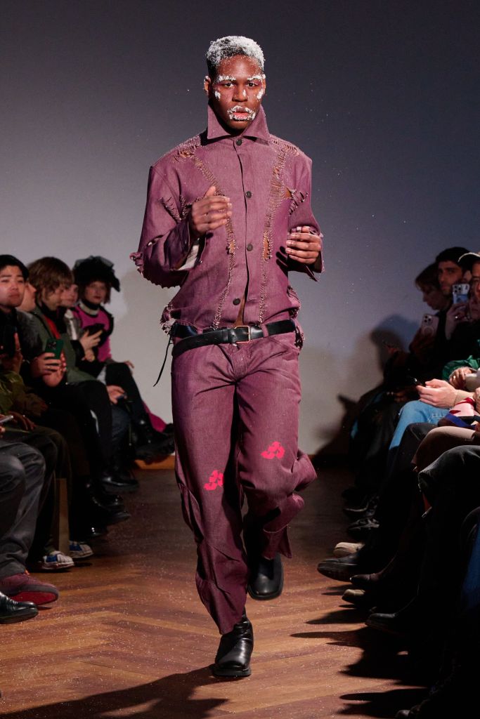The collection rejects traditional gender divisions, working with two fit systems—feminine and masculine—to create a balanced, inclusive presentation. Styling by Gianni.vas sharpens silhouettes, intensifying the tension and conceptual impact of each look. Makeup serves as social commentary, with visual cues referencing frostbite and snow, reflecting the reality in Ukraine, where attacks on civilian energy infrastructure have left populations without electricity and heating.
