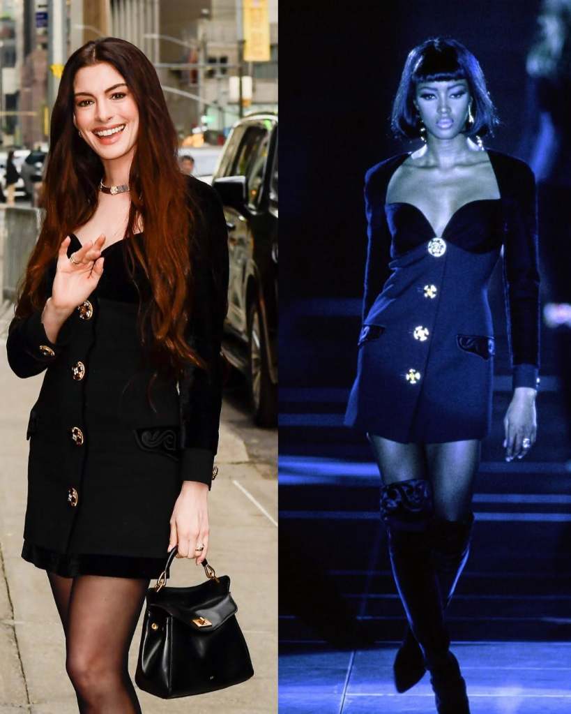 Originally seen on the runway and immortalized by Naomi Campbell, the design carries with it a sense of fashion history that few modern looks can replicate. Yet Hathaway didn’t simply recreate the past—she reinterpreted it. By trading the original boots for sleek platform heels, she injected a contemporary attitude into the archival piece, transforming it into something entirely her own.